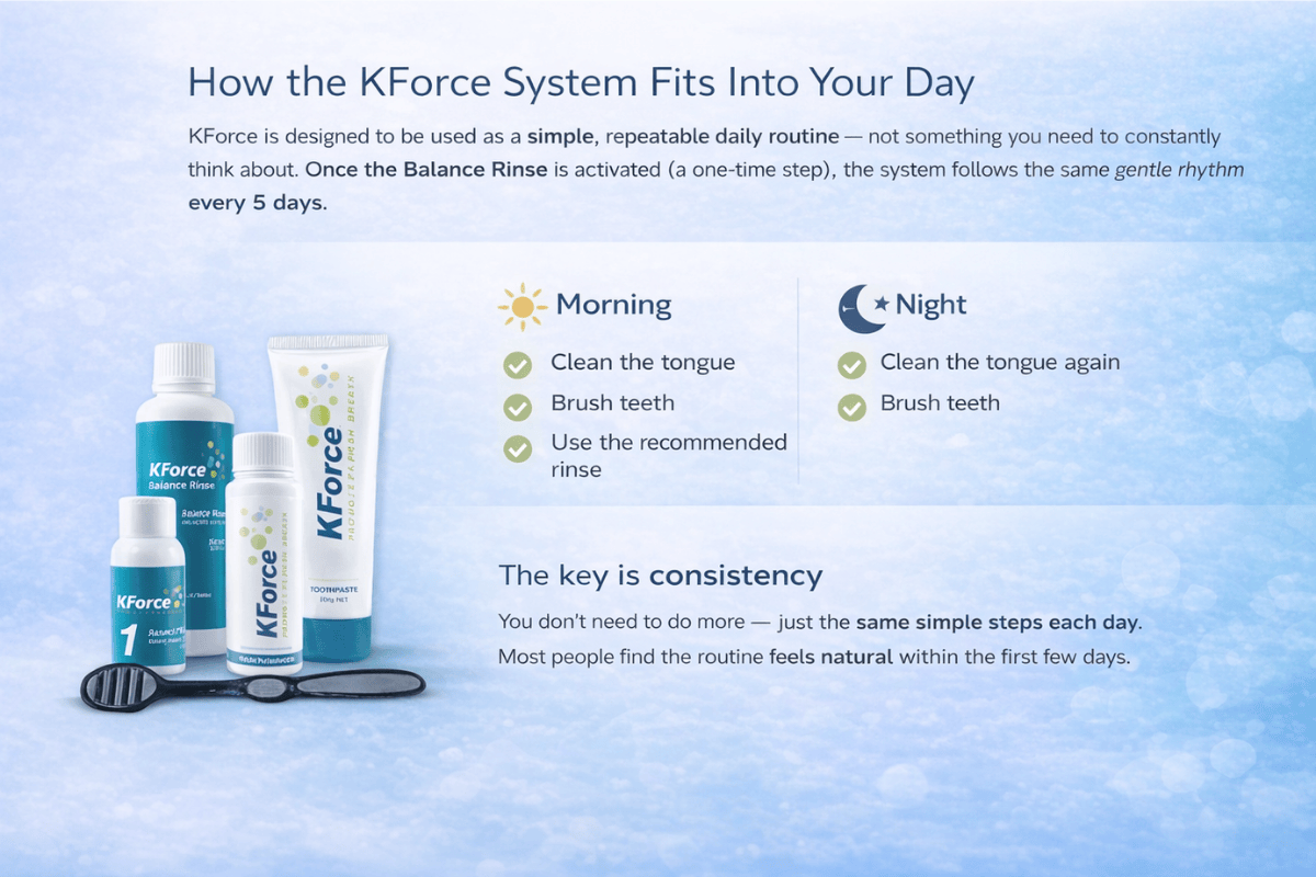 If you’ve been looking for a comprehensive, easy-to-follow oral care routine, the KForce System is designed to fit naturally into your day.