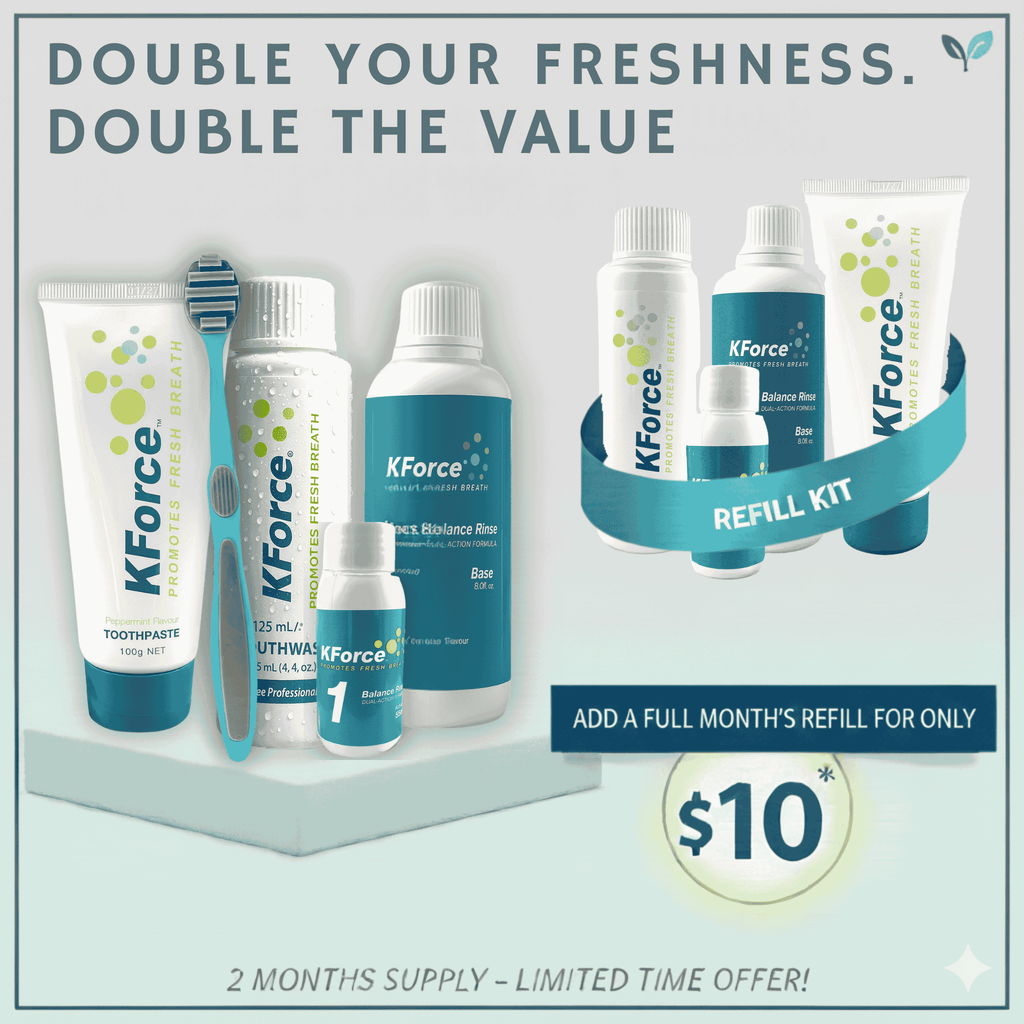 The special offer includes an additional KForce Refill Kit (containing KForce Toothpaste, Balance Rinse, and Day Rinse) to give you a total of 2 months supply.